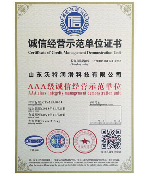 誠信經(jīng)營示范單位證書